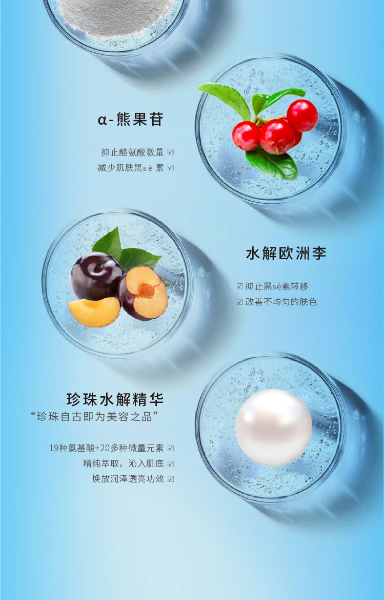 蕴含透明质酸钠与水解珍珠精华,为肌肤锁牢水分,搭配小球藻等植物提取精华,令肌肤水润、柔嫩、亮泽,改善