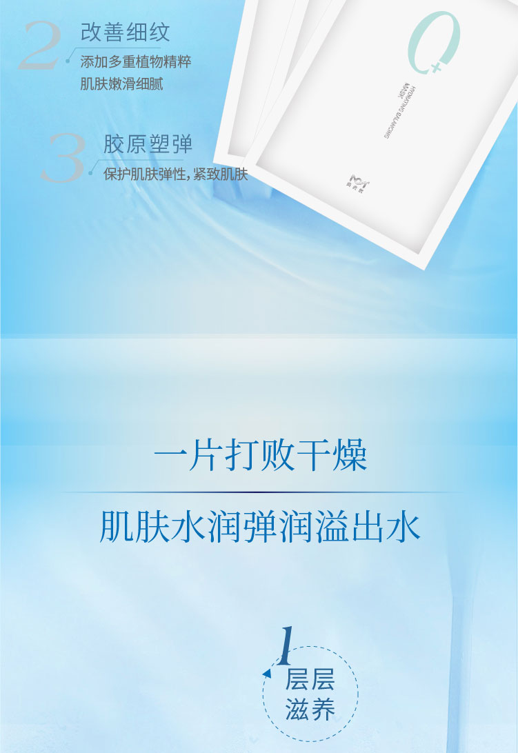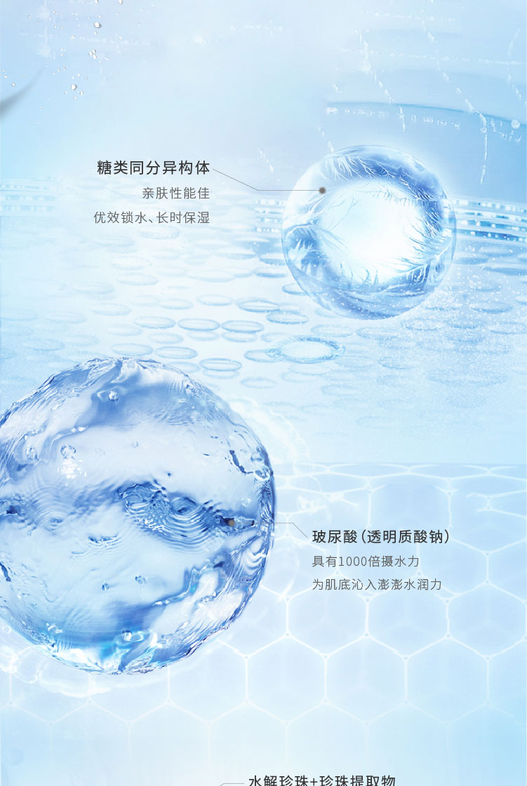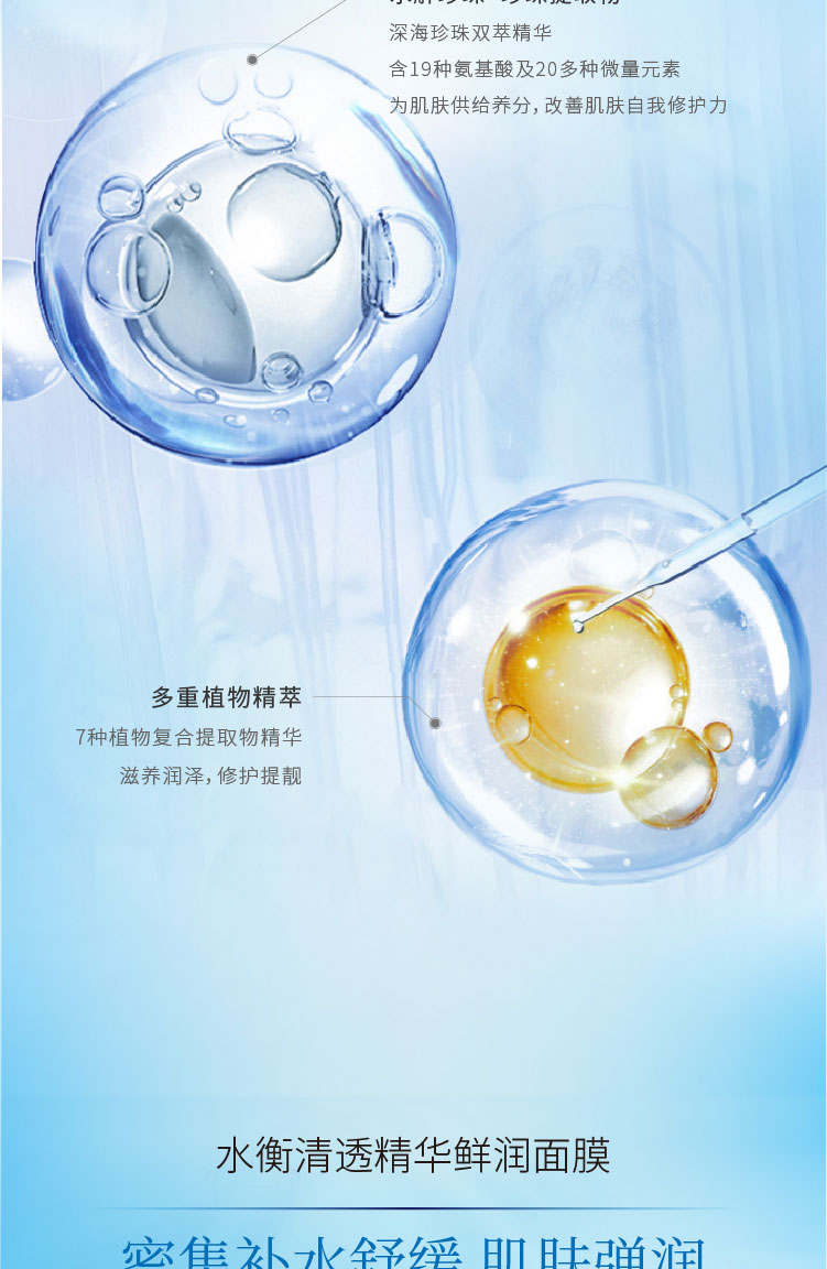 柔软丝滑的膜布,搭载充沛的精华液,贴合亲肤,轻柔透气;透明质酸配合水解珍珠精华持续补水,添加小球藻、