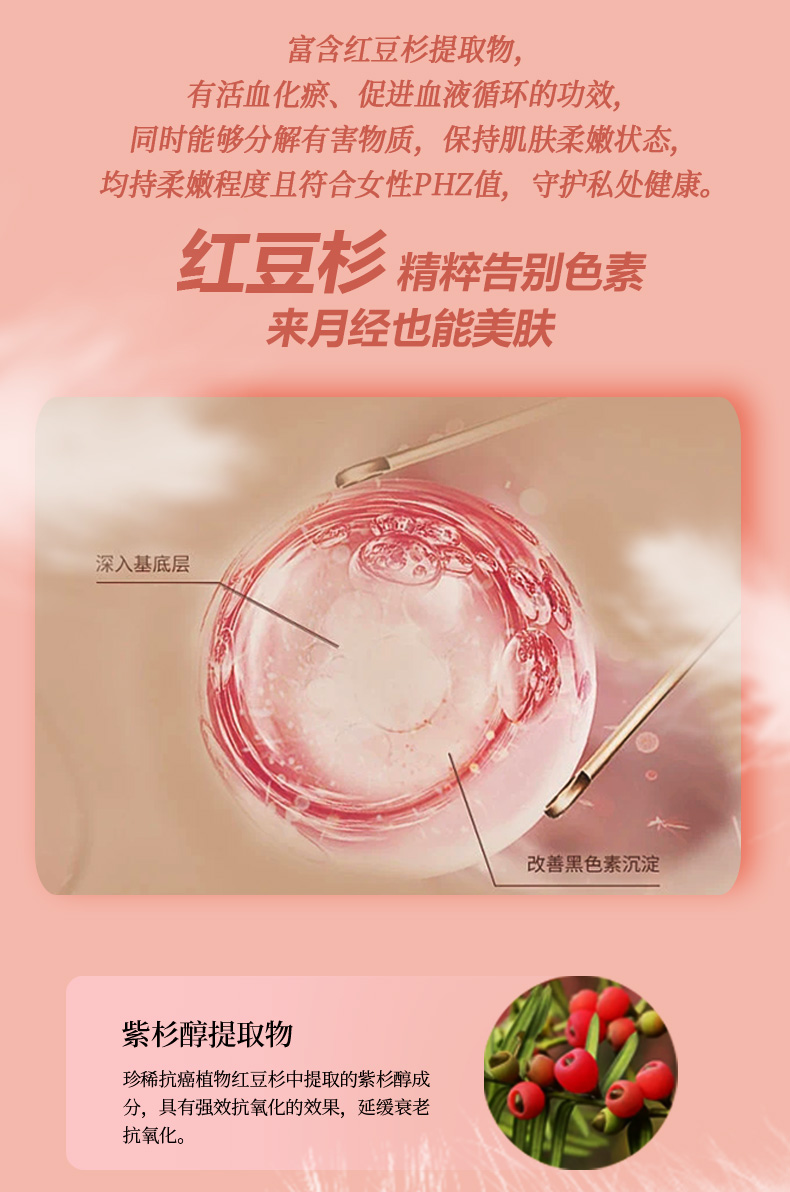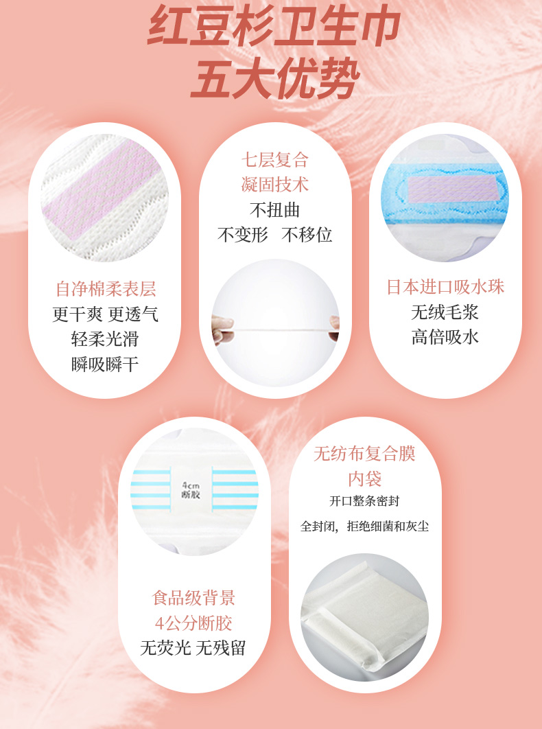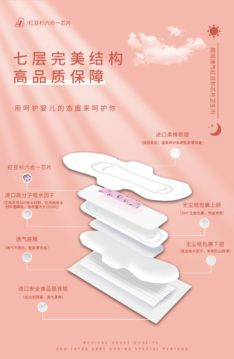 1.第一层:超柔棉表层,亲肤速渗,滋润皮肤,干爽卫生。 2.第二层:6合1红豆杉芯片(含负离子、纳米银、磁功能、远红外、 红豆杉、温变六种功能),抗氧化,改善自由基颜色,守护健康。 3.第三层:360°无尘纸包裹吸水纸,不断裂,抗变形。