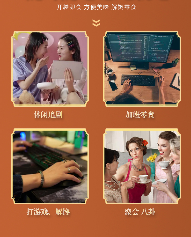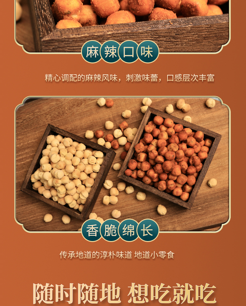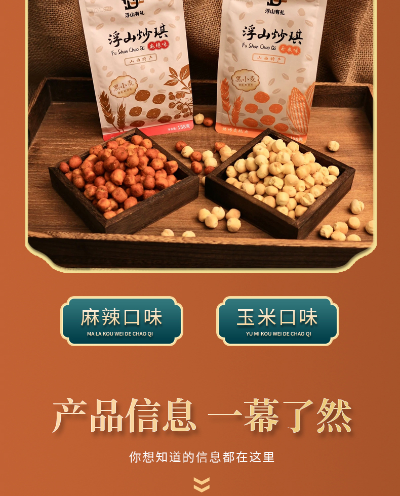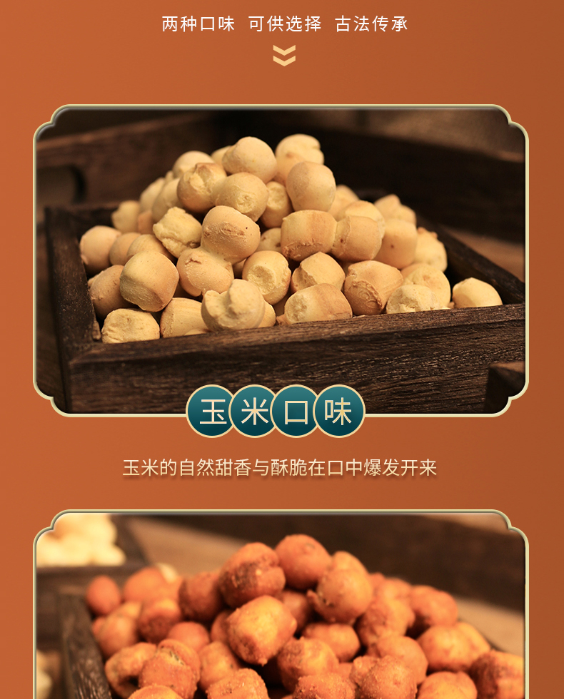 高温炒制而成,养胃健脾,四种口味满足咸甜、清淡等需求,酥脆可口,包装精美,适合送礼馈赠、旅途、日常等零食