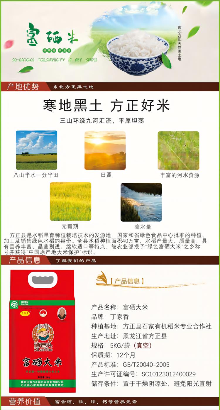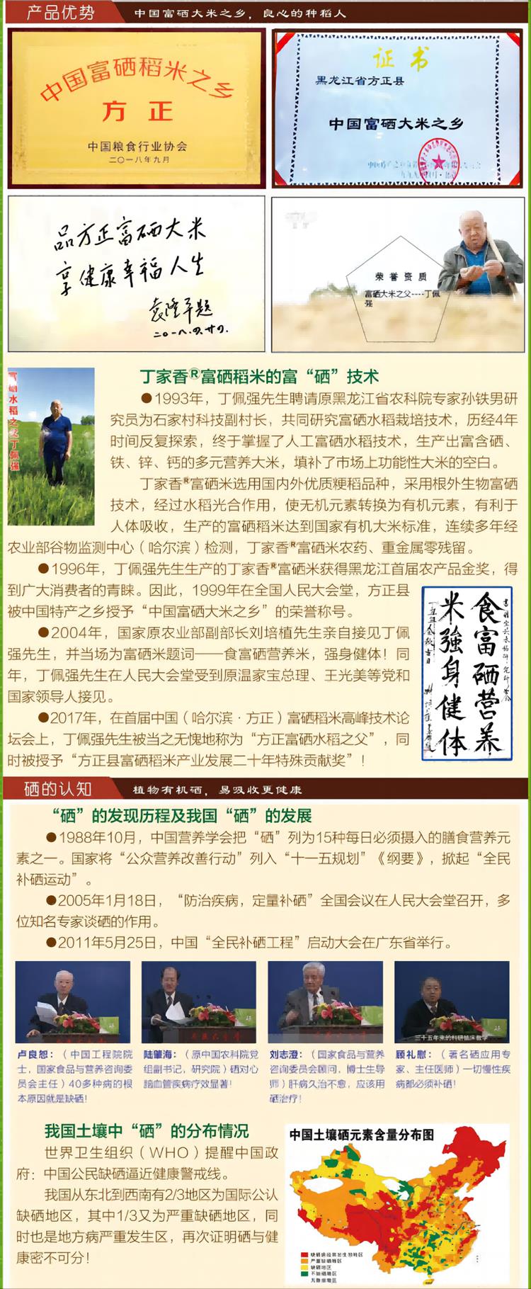 丁家香富硒米选用国内外优质粳稻品种,采用根外生物富硒技术,经过水稻光合作用,使无机元素转换为有机元素