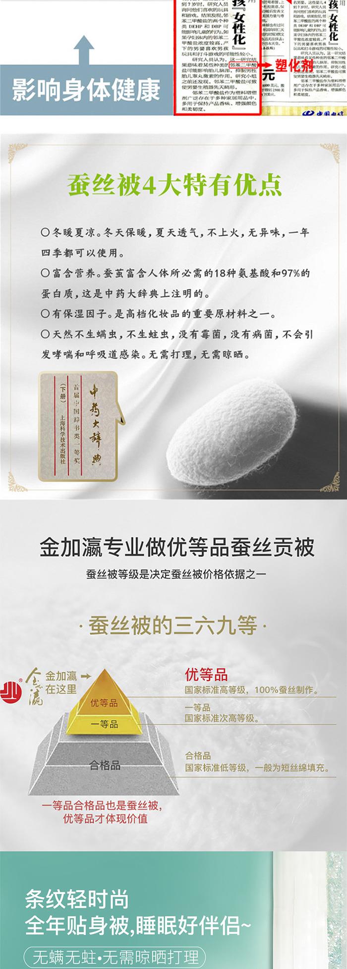 等级:优等品 表布:100%棉 填充物:100%柞蚕丝 丝重:300g 被重:2.6斤